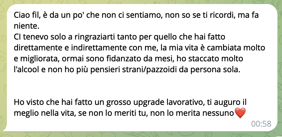Di recente ha visto il messaggio che ho lasciato nel nostro gruppo Telegram dove dicevo che cambiavo lavoro e prendevo un aumento importante. Ecco… il punto è che è cruciale ricevere messaggi come questo.